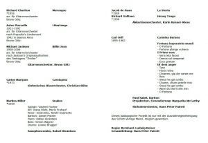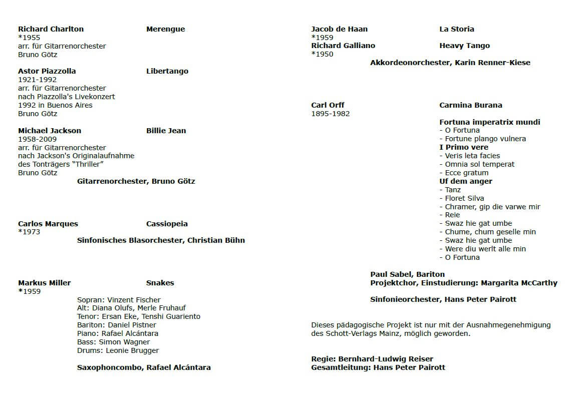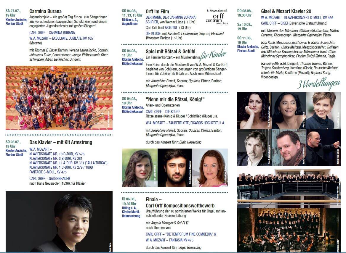 Samstag 27.07.2019 19.00 Uhr | Carl Orff Fest Kloster Andechs, Florian-Stadl Carmina Burana: Jugendpojekt – ein großer Tag für ca. 200 SängerInnen aus verschiedenen bayerischen Schulchören, u.A. Kammerchor Viva Voce der Städt. Sing- und Musikschule München, und einem engagierten Jugendorchester. Flyer des Festivals mit allen Veranstaltungen 27.07. – 11.08.2019 ![]() |