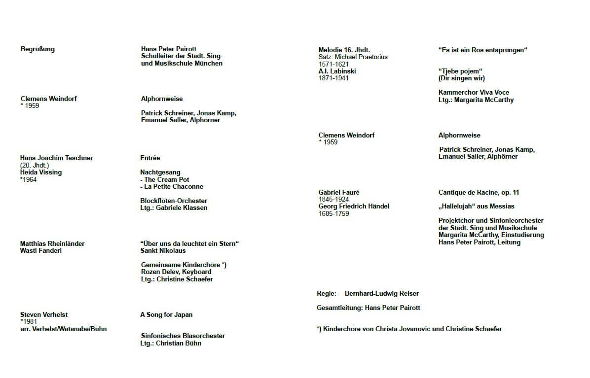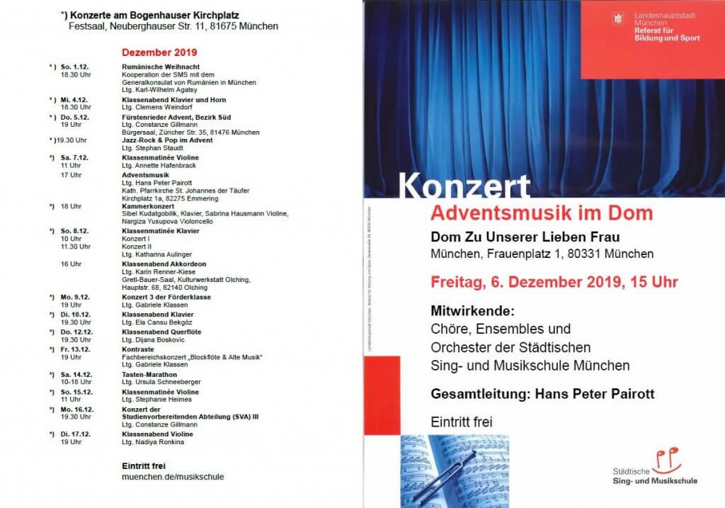 Freitag 6.12.2019, 15.00 Uhr | Adventsmusik im Dom Dom Zu Unserer Lieben Frau Frauenplatz 1, 80331 München Solisten, Chöre, Orchester der Städtischen Sing- und Musikschule. Gesamtleitung: Hans Peter Pairott. ![]() ![]() |