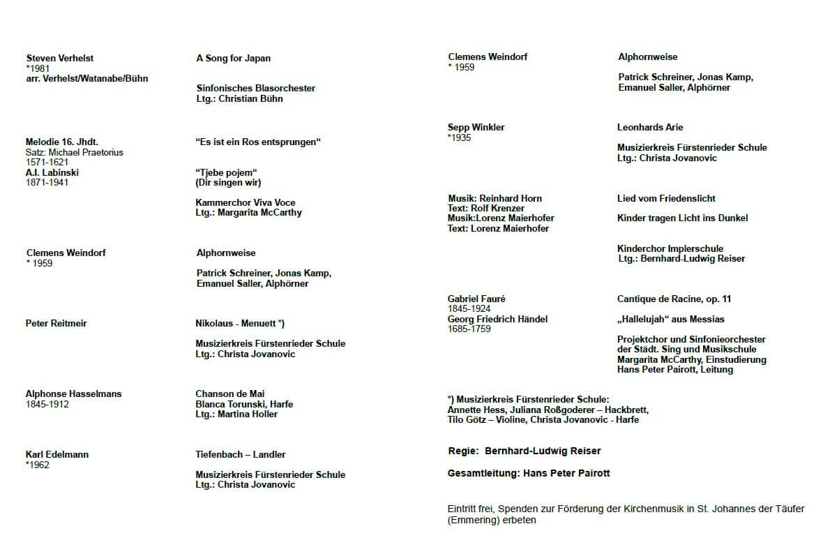 Samstag 7.12.2019, 17.00 Uhr | Adventsmusik Kath. Pfarrkirche St. Johannes der Täufer Kirchplatz 1a, 82275 Emmering Solisten, Chöre, Orchester der Städtischen Sing- und Musikschule. Gesamtleitung: Hans Peter Pairott. ![]() |